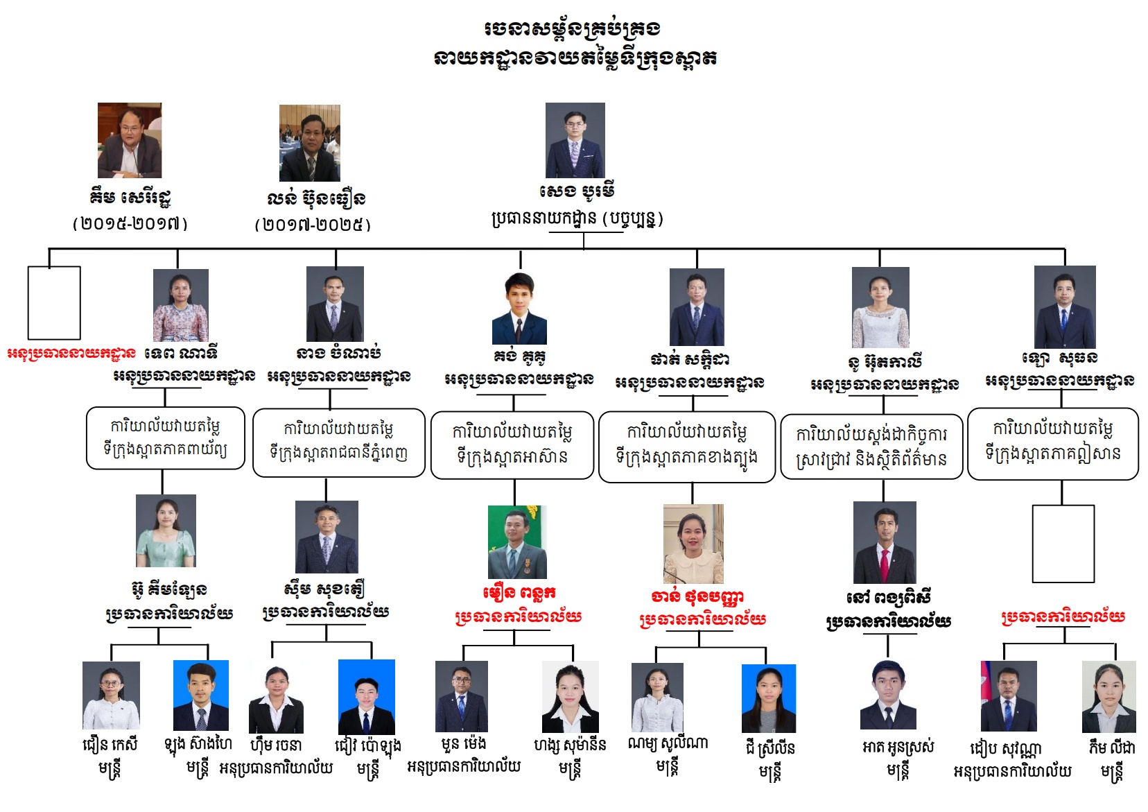 ក្រុងកំពង់ចាម ២. ក្រុងសួង ៣. ក្រុងតាខ្មៅ ៤. ក្រុងបាត់ដំបង ៥. ក្រុងព្រៃវែង ៦. ក្រុងសៀមរាប ៧. ក្រុងប៉ោយប៉ែត ៨. ក្រុងសេរីសោភណ្ឌ ៩. ក្រុងដូនកែវ ១០. ក្រុងច្បារមន ១១. ក្រុងស្ទឹងសែន ១២. ក្រុងកំពង់ឆ្នាំង ១៣. ក្រុងកំពត ១៤. ក្រុងស្វាយរៀង ១៥. ក្រុងបាវិត ១៦. ក្រុងពោធិ៍សាត់ ១៧. ក្រុងខេមរភូមិន្ទ ១៨. ក្រុងក្រចេះ ១៩. ក្រុងព្រះសីហនុ ២០. ក្រុងបានលុង ២១. ក្រុងព្រះវិហារ ២២. ក្រុងស្ទឹងត្រែង ២៣. ក្រុងសំរោង ២៤. ក្រុងសែនមនោរម្យ ២៥. ក្រុងប៉ៃលិន ២៦. ក្រុងកែប ២៧. ខណ្ឌ៧មករា ២៨. ខណ្ឌចំការមន ២៩. ខណ្ឌដង្កោ ៣០. ខណ្ឌដូនពេញ ៣១. ខណ្ឌទួលគោក ៣២. ខណ្ឌមានជ័យ ៣៣. ខណ្ឌសែនសុខ ៣៤. ខណ្ឌឬស្សីកែវ ៣៥. ខណ្ឌពោធិ៍សែនជ័យ ៣៦. ខណ្ឌជ្រោយចង្វារ ៣៧. ខណ្ឌច្បារអំពៅ ៣៨. ខណ្ឌព្រែកព្នៅ ៣៩. ខណ្ឌកំបូល ៤០. ខណ្ឌបឹងកេងកង ៤១. ក្រុងកោះរ៉ុង